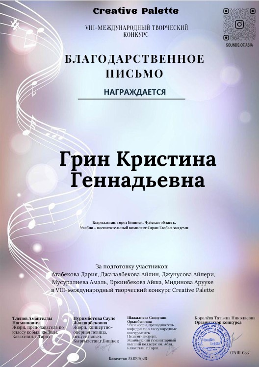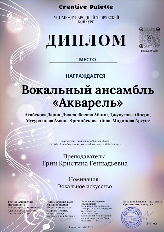 Вокальный ансамбль «Акварель» УВК «Эй-Би-Си Скул» завоевал I место на VIII Международном творческом конкурсе «Creative Palette» (Казахстан), итоги которого были подведены 25 марта 2026 года.