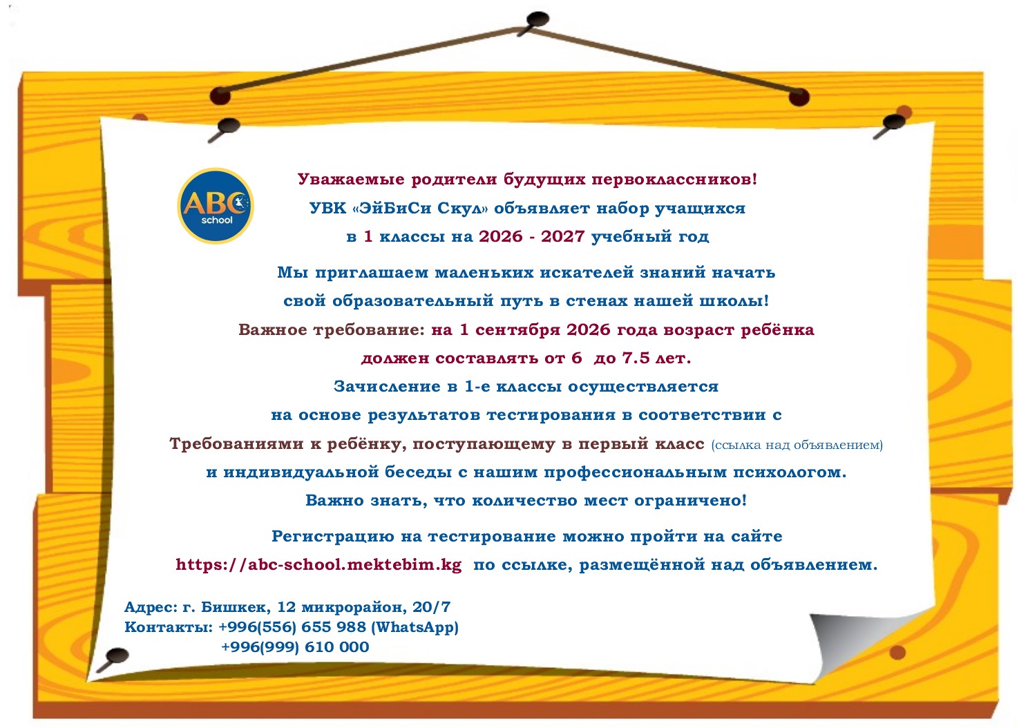 Регистрация учащихся в УВК ABC school на 2026 -2027 учебный год в 1 классы (ссылка на регистрацию) Требования к ребёнку, поступающему в 1-ый класс
